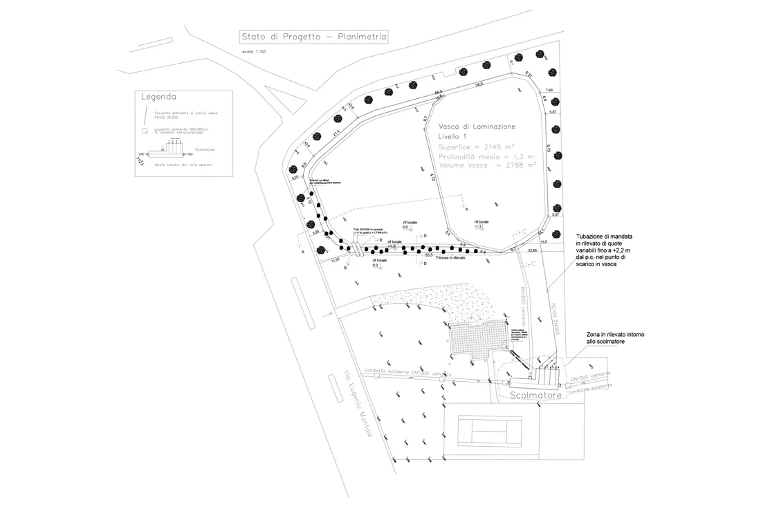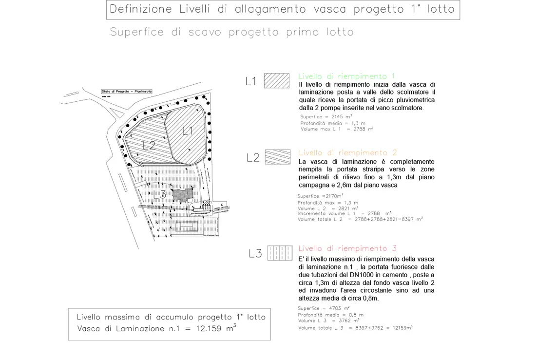 The filling level starts from the lamination tank located downstream of the spillway which receives the peak rainfall flow rate from the 2 pumps inserted in the spillway compartment. The lamination tank is completely filled and the flow overflows towards the relevant perimeter areas up to 1.3m from the ground level and 2.6m from the tank level. It is the maximum filling level of the rolling tank n.1, the flow rate comes out of the two concrete pipes of the DN1000, located approximately 1.3m high from the bottom of the level 2 tank and invades the surrounding area up to an average height of approximately 0.8m.