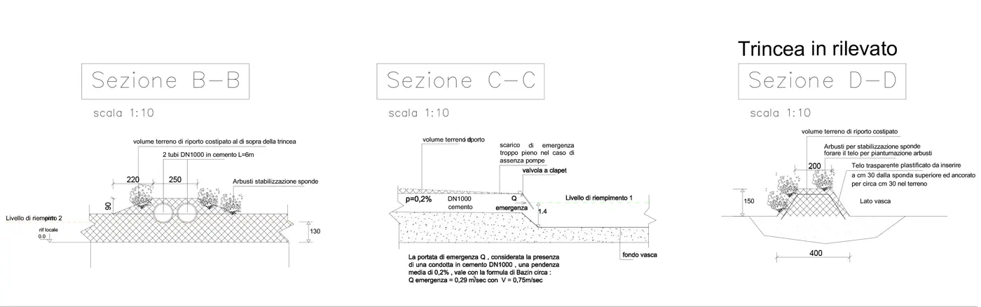 c) In the event of the pumps not functioning, an emergency gravity drain has been inserted through a DN1000 concrete pipe, which is activated at the upper generator of the inlet pipe, guaranteeing a one-way drain as it is equipped with a valve downstream with clapet, functioning for a reservoir of approximately 1400m